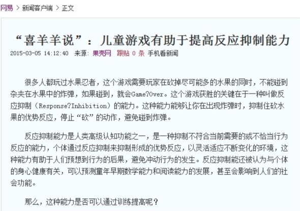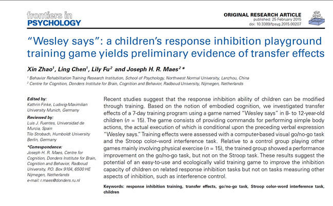 该项研究成果于2015年2月25日在《Frontiers in Psychology》杂志在线发表,我院赵鑫博士为该论文的第一作者,365上市公司行为康复训练研究中心为第一完成单位。研究一经发表,便受到国内科技媒体的关注。著名科技网站“果壳网”在2015年3月4日以“喜羊羊说”:儿童游戏有助于提高反应抑制能力”为题在首页对此项研究成果进行了推介,网易新闻中心、快科技以及国内一些网站的科技频道也对此项研究成果进行了转载和报道。