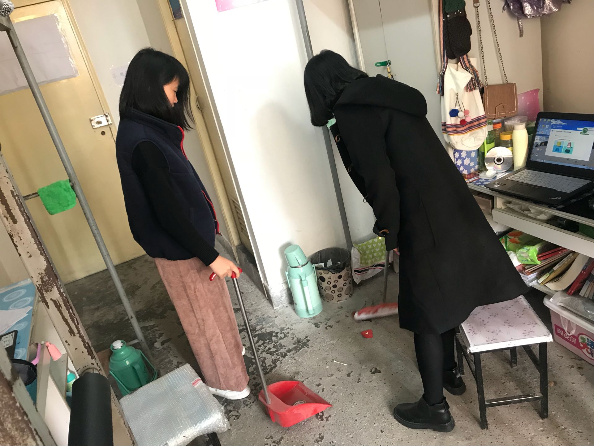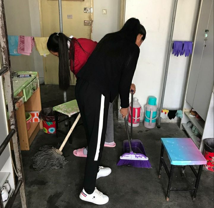 清扫开始前,各宿舍长明确分工,将笤帚、簸箕、抹布等清扫工具分配到每位舍员的手中,并清楚划分了各人的清扫区域。