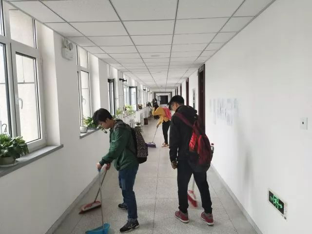 全体成员进行了工作分配,每位成员都明确了自己的清扫任务。对特教楼的墙壁、门窗和玻璃等进行了清理,并对地面以及门后死角等进行了清扫。