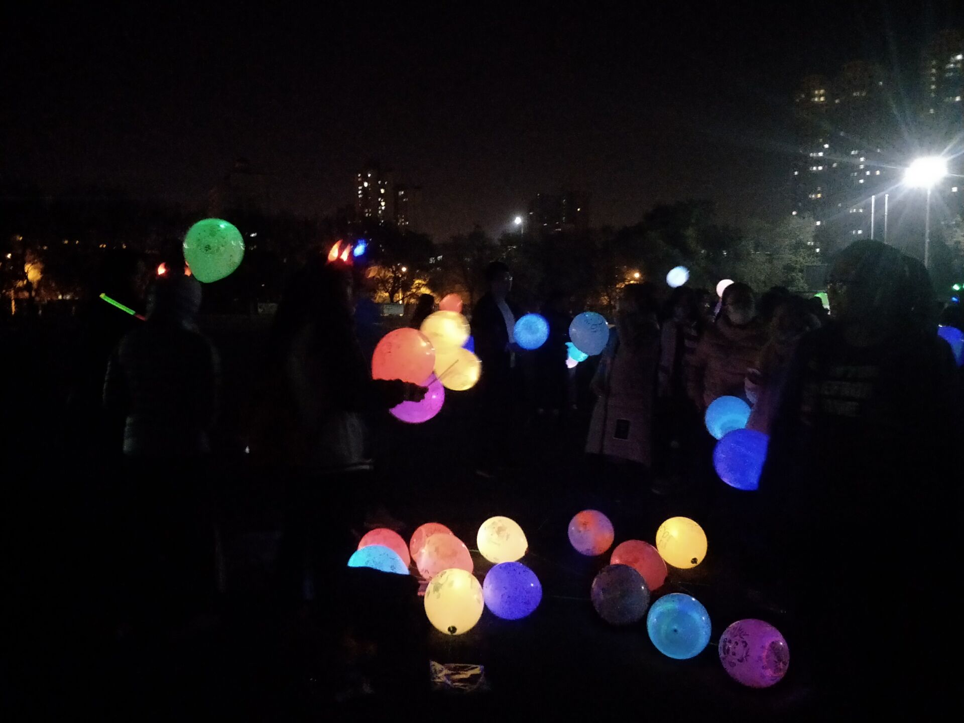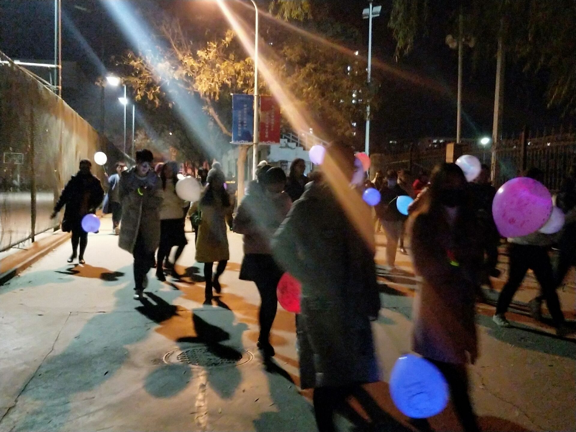 同学们首先在西操场集合,进行了简单的分组并发放了荧光棒和气球等物品,之后大家打开了手机keep软件,正式开始了荧光夜跑。