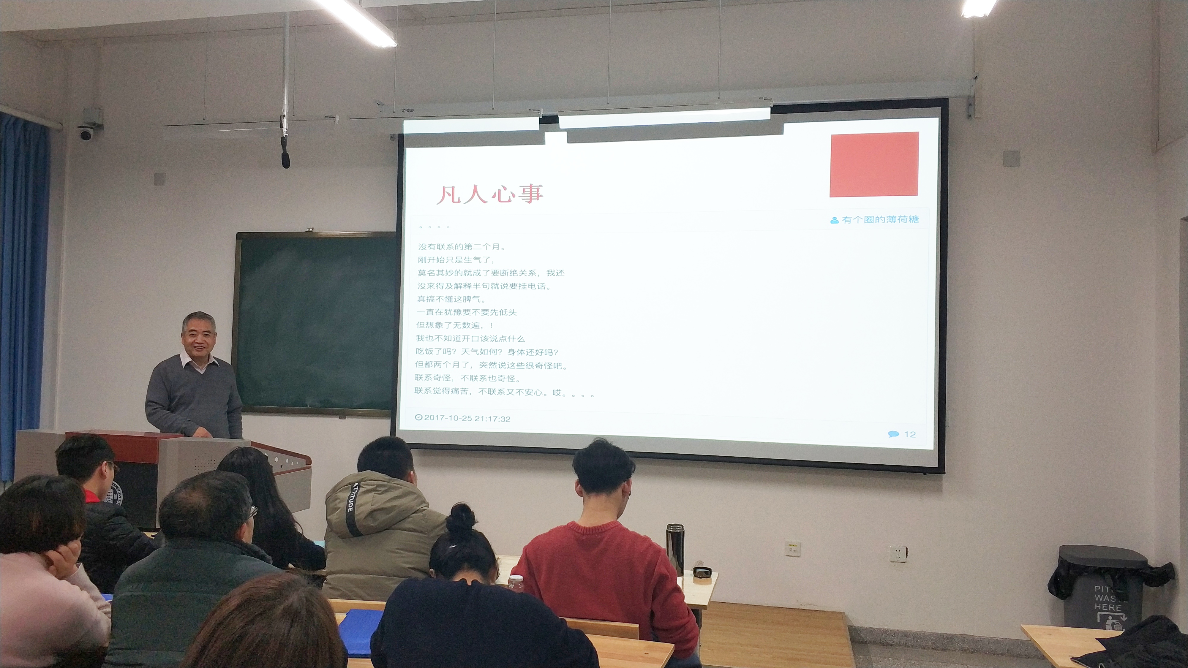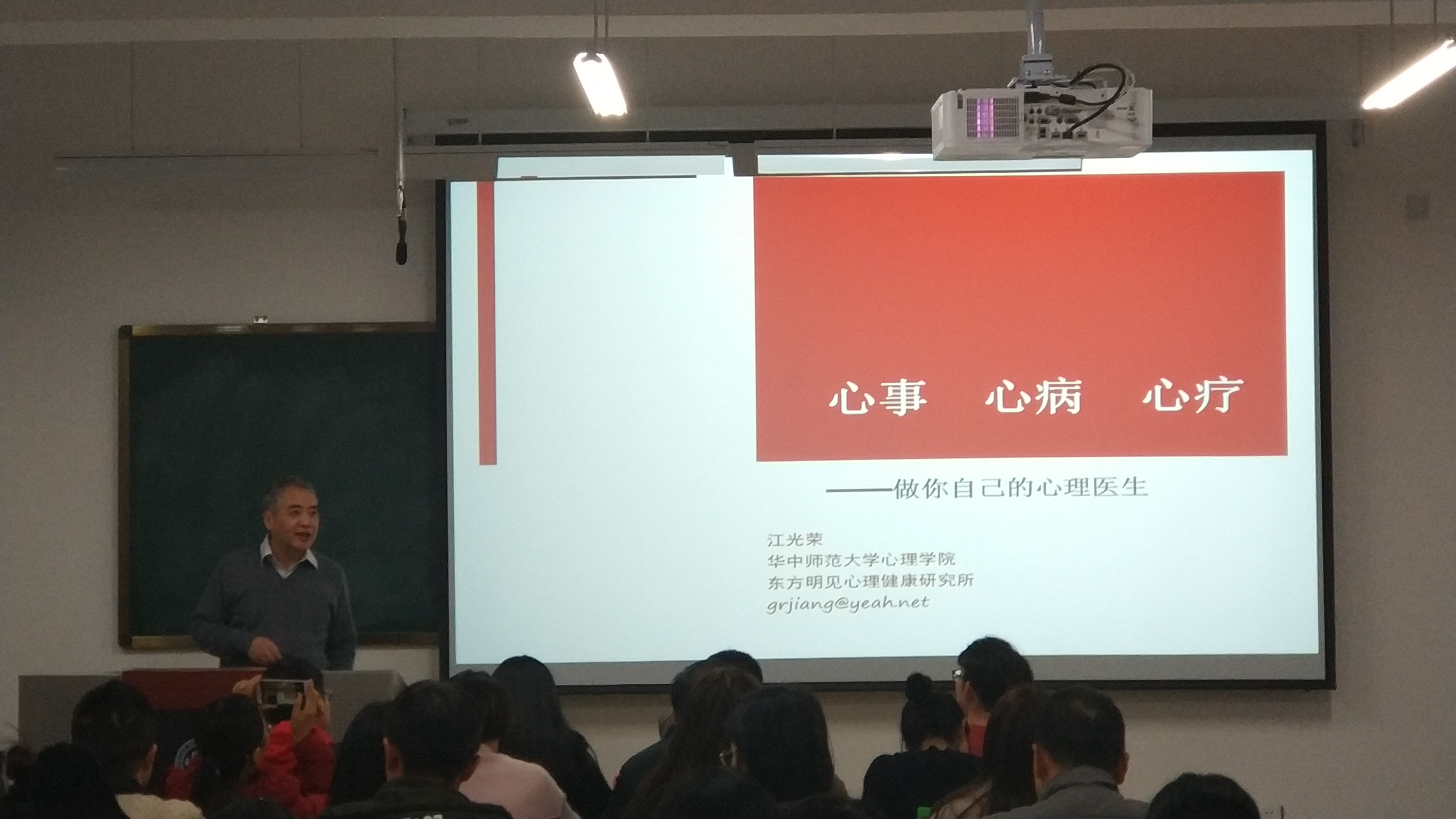 2018年1月16日19点,华中师范大学365上市公司江光荣教授在特教楼218教室做了题为“心事、心病、心疗”的学术报告。365上市公司80余名研究生参加此次报告,报告由365上市公司丁小斌副院长主持。