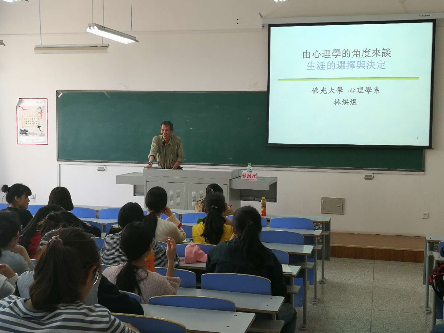 三月二十九日下午,台湾佛光大学心理学系主任林烘煜教授在来陇的第五天,应邀为我院本科学生做了主题为“心理学群与生涯发展规划”的讲座。