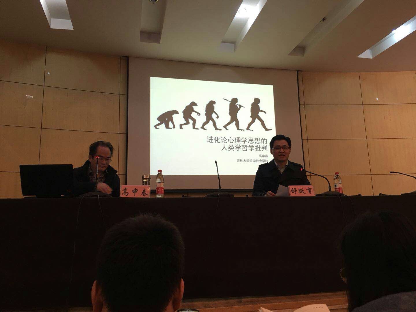 在报告开始阶段,高申春教授给我们讲述了他自身的学习以及研究内容;此次报告主要以“进化论心理学思想的人类学哲学批判”来展开,以进化心理学思想的历史流变、进化论作为生物学科学思维的一般原理、进化论心理学思想体系的思想逻辑、怀疑论批判的声音及其人类学哲学的逻辑指向为主要内容来讲解。他将哲学与心理学相联结,他以我们最熟知的心理学中各领域的创始者为例子,让我们很容易地理解老师所讲的内容之外,也从中明白了 心理学发展历程当中的哲学思想。报告结束时,由舒跃育老师就这次的报告情况做了总结。