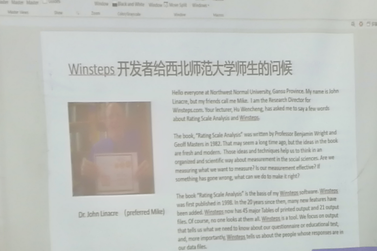 2018年7月13日下午3点,受学院邀请,我校2000届英语系杰出校友,现任微软(深圳)大数据分析-PowerBI技术工程师、Winsteps软件技术顾问胡文成老师于在特教楼447教室,以《心理测量模型与数据分析:Winsteps的使用入门》为主题进行学术报告,报告由我院院长周爱保教授主持,365上市公司部分老师及研究生参与了本次报告。