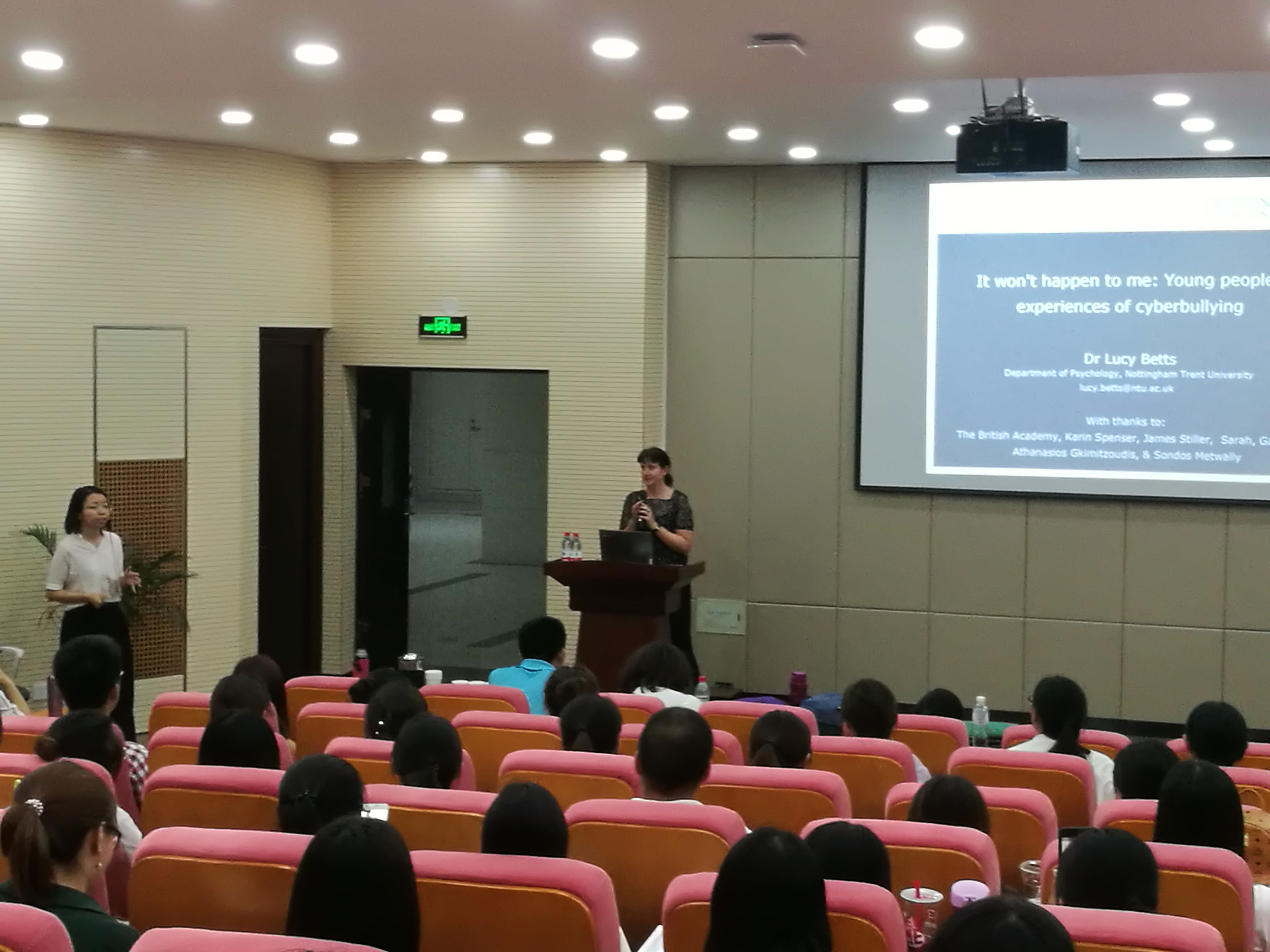 2018年7月19日晚,英国诺丁汉Trent大学(Nottingham Trent University)Lucy Rebecca Betts博士,Lai Sang Iao博士,以及Bethany Shannon Huntington,在特教大楼159报告厅分别进行了题为“It won’t happen to me: young people’s experiences of cyberbulliying”(我不会遇到:年轻人网络霸凌经历),“Theory of mind and autism”(心理理论与孤独症)以及“Virtual Reality Exposure Therapy for Social Anxiety”(社交焦虑的虚拟现实暴露疗法)的报告。报告由365上市公司周爱保老师主持,365上市公司和教育学院100余名教师、非全日制研究生以及部分本科生参加了此次讲座。报告引起了大家广泛的兴趣,每一阶段的报告结束后,同学们就自己关心的学术问题与三位英国老师进行了热烈的交流,拓展了同学们的学术视野。