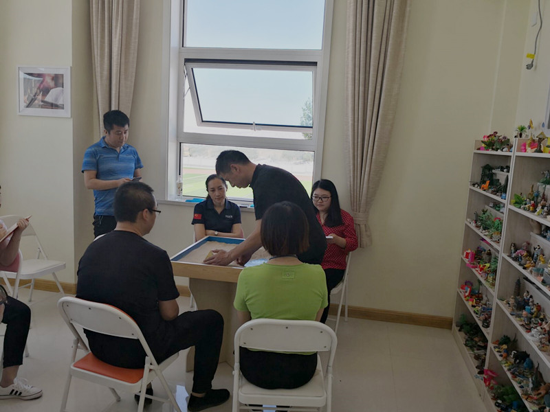 在沙盘体验后,大家都被沙盘游戏治疗的魅力所吸引,于是6月15日晚在英国365公司特教楼沙盘室又进行了一次沙盘体验。