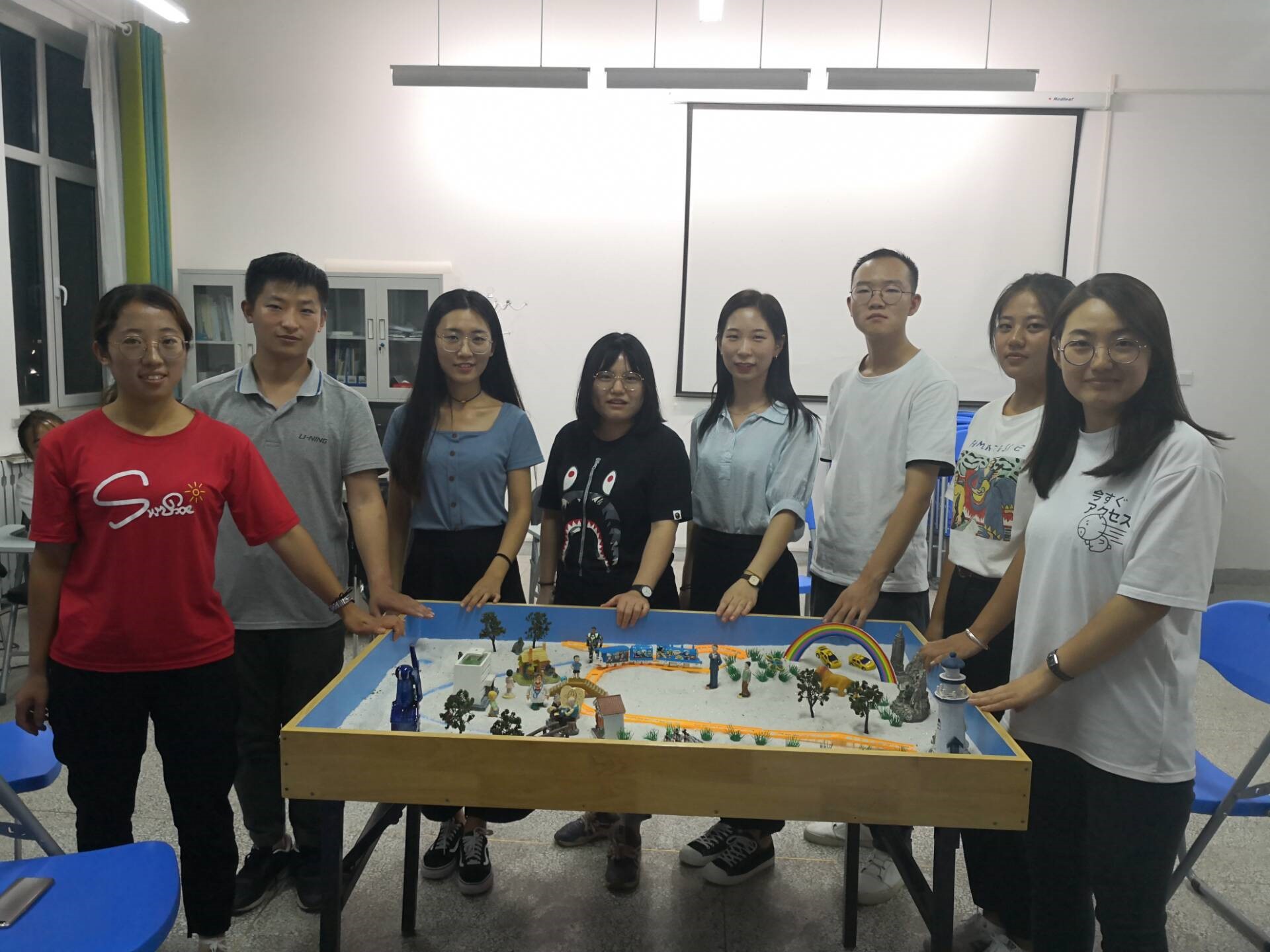 硕士研究生郭瑾瑾带领新生体验沙盘,除了帮助新生了解沙盘技术外,同时也促进了新生之间的交流。