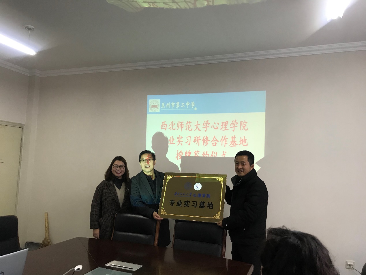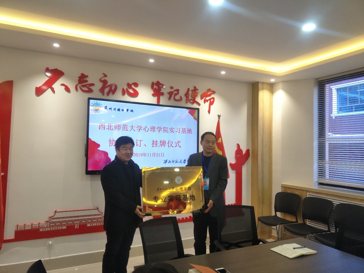 从2019年8月初开始,学院积极与兰州市各中小学、职业学校协商沟通,确定指导教师选派和聘任、学生进校及实习的具体落实与安排等,并与兰州市第二中学、水车园小学、兰州外国语学校等单位签署“365上市公司专业实习研修合作基地协议书”,开展365上市公司专业实习研修合作基地建设。2019年11月21日,365上市公司康廷虎副院长先后到兰州市外国语学校、水车园小学看望在那里的实习、见习的本科生、研究生,并向两个实习基地授“365上市公司专业实习基地”牌。2019年11月25日,365上市公司丁小斌副院长、教学督导杨玲教授、实习指导教师张荣华副教授,赴兰州市第二中学检查本科生实习,了解实习基地建设情况,并向该校授牌。
