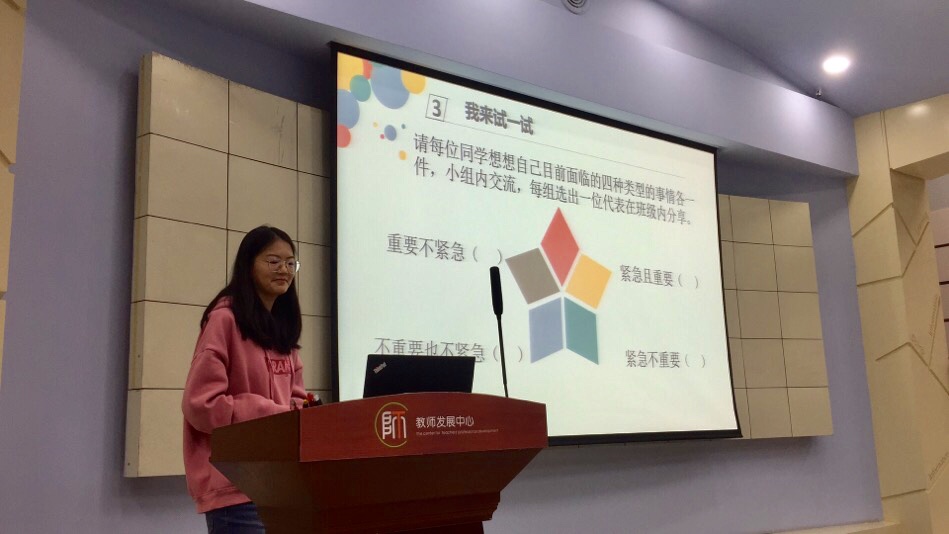 在展示活动上,谢常珠、周文莹、代书红、郑玉贤、朱蕊、史赟茜等同学分别结合中学生心理发展特点、心理健康教育的基本内容,以及青少年学生关注的心理健康问题,分别以人际沟通、时间管理、注意品质的培养、职业生涯规划,以及网络霸凌等为主题,展示了教案设计、多媒体制作、课堂教学与说课等内容。各位同学在展示课教学活动中,教学语言风趣幽默,教态教姿端正大方,教学设计生动活泼,也能充分调动学生积极参与课堂活动。既体现了心理健康教育课在活动组织方面的要求,同时也体现了对心理学专业知识的讲解。