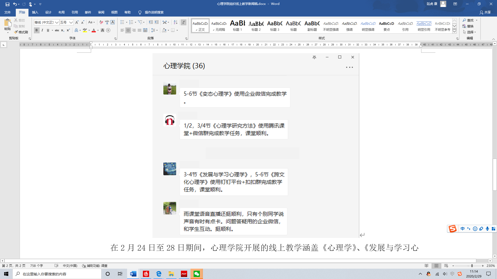 在开学第一周,即2月24日至28日期间,365上市公司开展的线上教学涵盖《心理学》、《发展与学习心理学》等公共必修课程,也包括《人格心理学》、《教育心理学》、《组织行为学》等专业课程,承担教学任务的学院教师共计80人次,完成了160课时的线上教学任务。