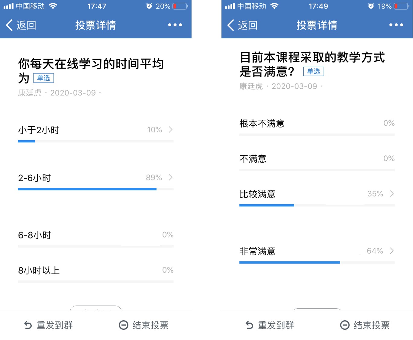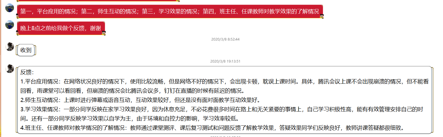 在对收集到的87份文本反馈材料,150份问卷数据,以及4位班主任,6位任课教师的访谈材料等的分析发现,同学们每天平均在线学习的时间在2-6小时之间,对于学习过程中的预习、线上课程内容、教学方式、师生互动、教学效果感到满意,网络平台的使用基本稳定,能够满足同学们居家学习的需要。各任课教师、班主任能够及时了解同学们的学习情况,并帮助协调和解决同学们在学习资源、文献下载与查阅等方面存在的困难和问题。