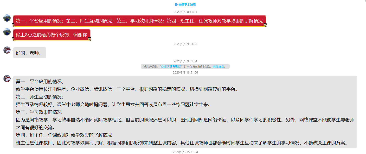 在新冠疫情影响的情况下,学院通过积极组织和推进线上教学,保障“停课不停教 停课不停学”。为了及时了解开学以来学院本科生在线学习的情况,学院于3月5日开始,通过微信、QQ、企业微信等媒介,从软件平台应用、师生互动、学习效果等方面,对学院任课教师、班主任,以及各年级本科生进行了问卷、访谈等调查。