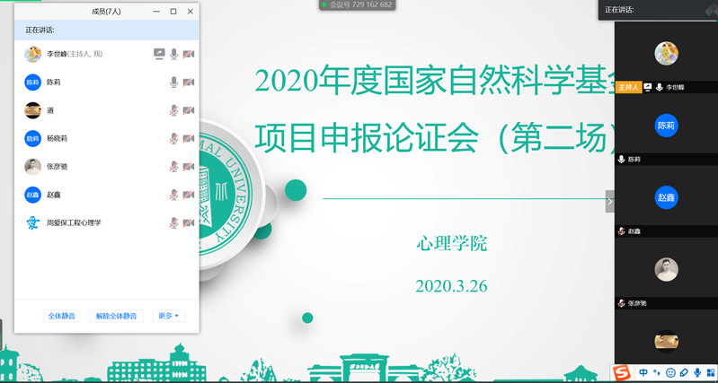 2020年3月26日下午,我院举行2020年度国家自然科学基金申报线上论证会。此次论证会邀请了周爱保教授作为主要评议人,对我院拟申报2020年度国家自然基金项目的申报书进行指导。论证会上,我院陈莉老师就此次申报项目的研究意义、研究内容、技术路线以及可行性等方面逐一进行了汇报,主要评议人及参会的老师对项目申报书中存在的问题进行了分析,并提出了修改意见。线上申报会由我院科研秘书李世峰博士主持,我院8位教师参加了此次线上论证会。