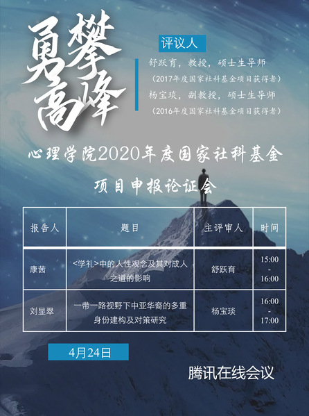 2020年4月24日下午,我院举行了第二场2020年度国家社科基金申报线上论证会。此次论证会邀请了舒跃育教授和杨宝琰副教授作为主要评议人,对我院拟申报2020年度国家社科基金项目的申报书进行指导。论证会上,我院康茜老师和刘显翠老师就此次申报项目的选题的背景、研究意义、研究内容、主要目标以及思路方法等方面逐一进行了汇报,主要评议人及参会的老师对项目申报书中存在的问题进行了分析,并提出了修改意见。线上申报会由我院科研秘书李世峰博士主持,我院10余位教师参加了此次线上论证会。