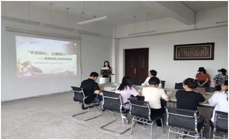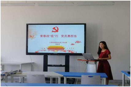 讲抗击疫情故事,激扬青春力量。研究生第二党支部的徐玥歆同志以《致敬抗疫英雄——抗疫英雄事迹》为题,讲述了抗疫英雄—金银潭医院院长张定宇、王辰院士、杜富国的妹妹杜富佳等三位抗击疫情英雄的故事,研究生第一党支部的张婷婷同志分享了“疫情下的中国力量”,研究生第三党支部的崔延琪同志以《青春战“疫”行 党员勇担当》为题讲述了奋战在抗“疫”一线青年党员的故事。研究生第三党支部的高玲同志以《绽放青春的绚丽》为题讲述了广西第七批援湖北省抗疫医疗队员梁小霞同志用生命守护生命的感人故事。