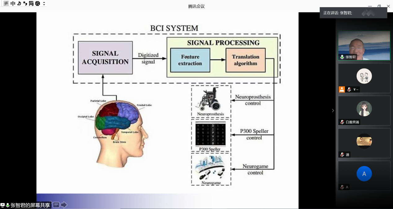 报告会上,张智君老师从瘫痪少年通过脑机接口完成巴西足球赛的开球,高位截瘫患者通过脑机接口控制自己的手臂和手掌完成抓握咖啡动作等生动事例引入目前侵入性脑机接口的研究,之后从利用注意力水平改变智能灯泡的颜色等事例引入非侵入性的脑机接口研究。报告中,张智君老师还重点介绍了脑机接口的概念,原理,模型及脑机接口不同大脑活动信号的优缺点。