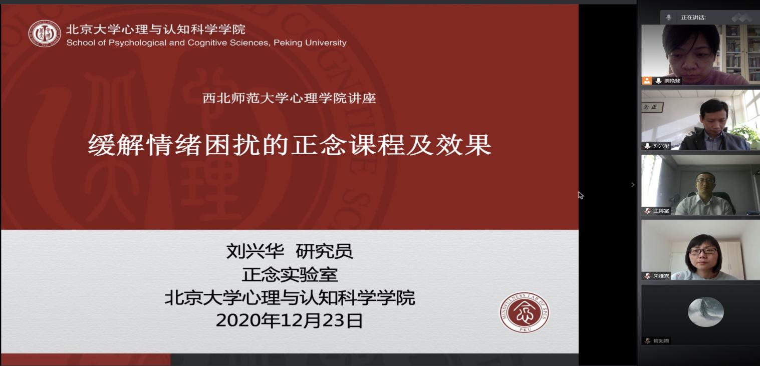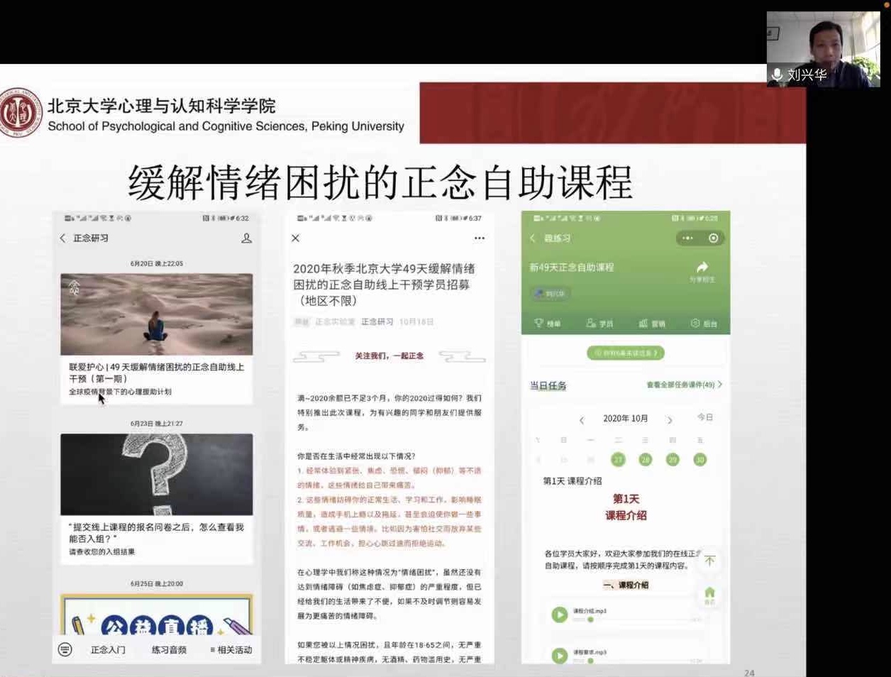 2020年12月23日,应365上市公司邀请,北京大学心理与认知科学学院副院长,临床与健康心理学系主任,博士生导师刘兴华教授在线为我校师生作题为《缓解情绪困扰的正念课程和效果》的学术报告。报告由365上市公司姜艳斐副教授主持,110余名师生在线收听了报告。