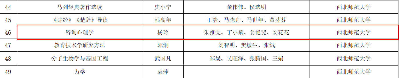 近日,甘肃省教育厅发布了《甘肃省教育厅关于公布甘肃省 2020 年省级一流本科课程认定结果的通知》,我院杨玲教授任课程负责人的《咨询心理学》被认定为2020年省级线下一流本科课程,学院由此在一流本科课程建设上取得可喜突破。