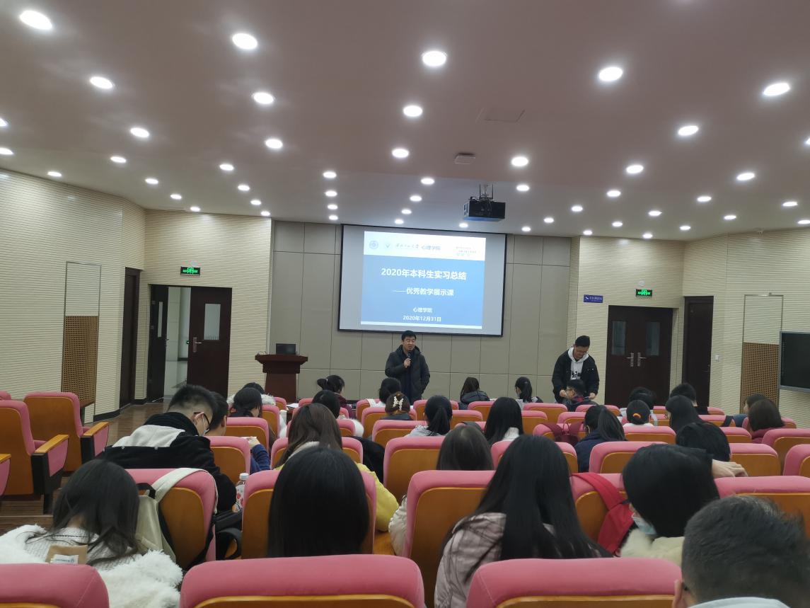 365上市公司本科生实习返校之后,组织了优秀教学展示课活动。2020年12月31日上午,2017级本科实习生优秀教学展示课活动在特教楼159教室举行。365上市公司院长赵鑫教授、副院长康廷虎教授、应用心理系主任刘显翠副教授参加了本次活动。2017级全体实习同学、2019级心理学类1班的同学,以及其他班级年级同学,共156人观摩学习了优秀教学展示课。活动由应用心理系主任刘显翠副教授主持。