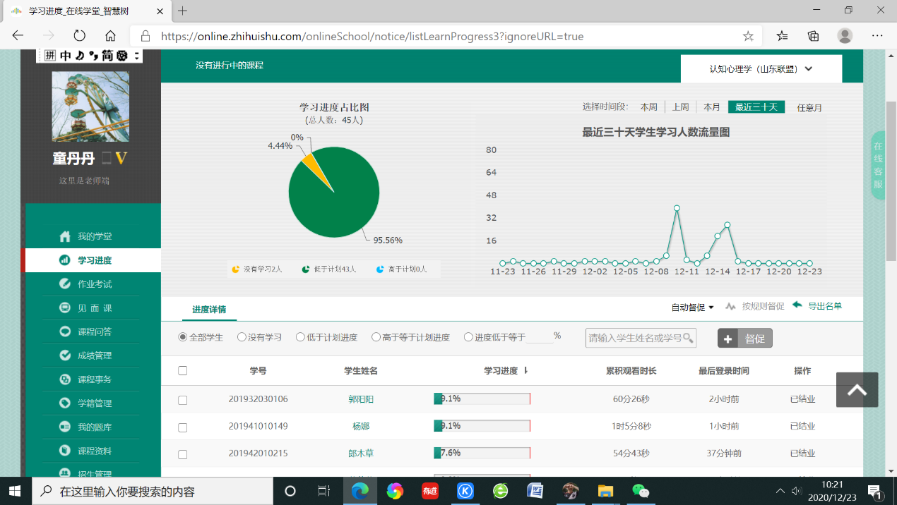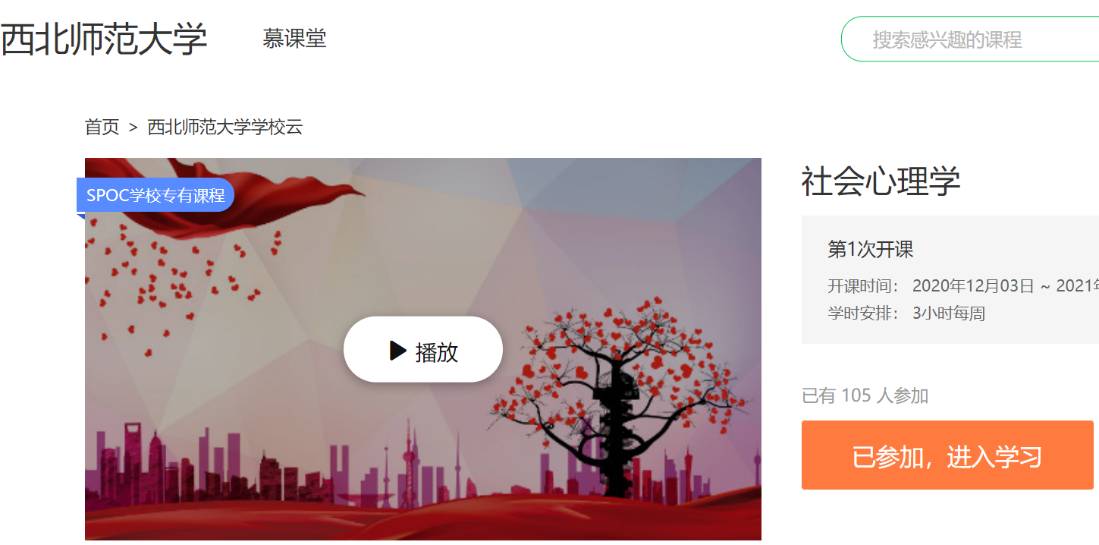 此外,承担本科生专业课程《社会心理学》教学的雍琳副教授,引入中国大学慕课平台的国家精品课程线上资源,建设《社会心理学》线上线下混合课程,探索教学模式的创新,并在2020年秋季学期的教学实践中得到应用。该课程初次开课学习人数达到105人,目前,该课程的运行效果良好。