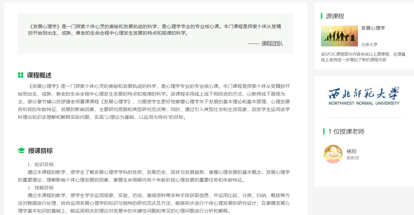 在学校的支持下,365上市公司于2020年组织《发展心理学》线上线下混合式 “金课”建设。该课程由学院杨阳副教授主持,引入了中国大学慕课平台的《发展心理学》线上课程资源。该课程线上资源是由北京大学苏彦捷教授组织建设,课程资源丰富,内容活泼生动,得到了众多好评。