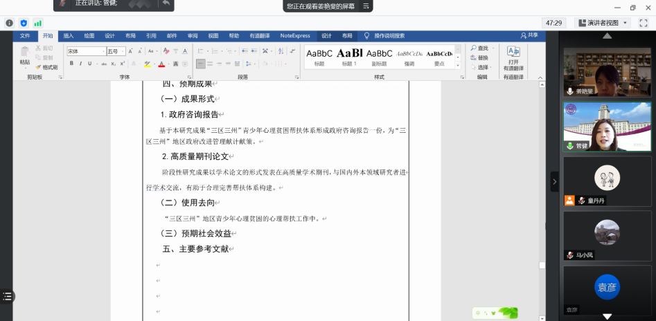2021年1月31日下午,我院举行2021年度第二场国家社科基金/教育部人文项目线上申报论证会。此次论证会邀请了南开大学周恩来政府管理学院社会心理学系教授,南开大学社会科学研究部常务副部长管健教授作为评议人对我院拟申报2021年度国家社科基金项目/教育部人文项目的申报书进行指导。申报论证会由我院副院长马小凤教授主持,院长赵鑫教授及二十余位教师参加了此次论证会。