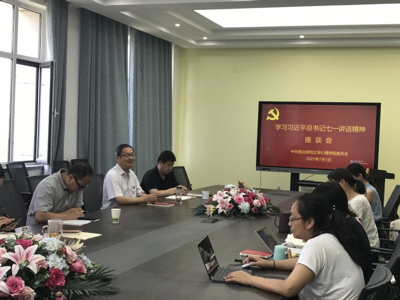 在庆祝大会直播结束后,学院党委在特教楼401会议室召开学习习近平总书记庆祝中国共产党成立100周年重要讲话精神座谈会。党委书记刘慧阳同志主持会议。