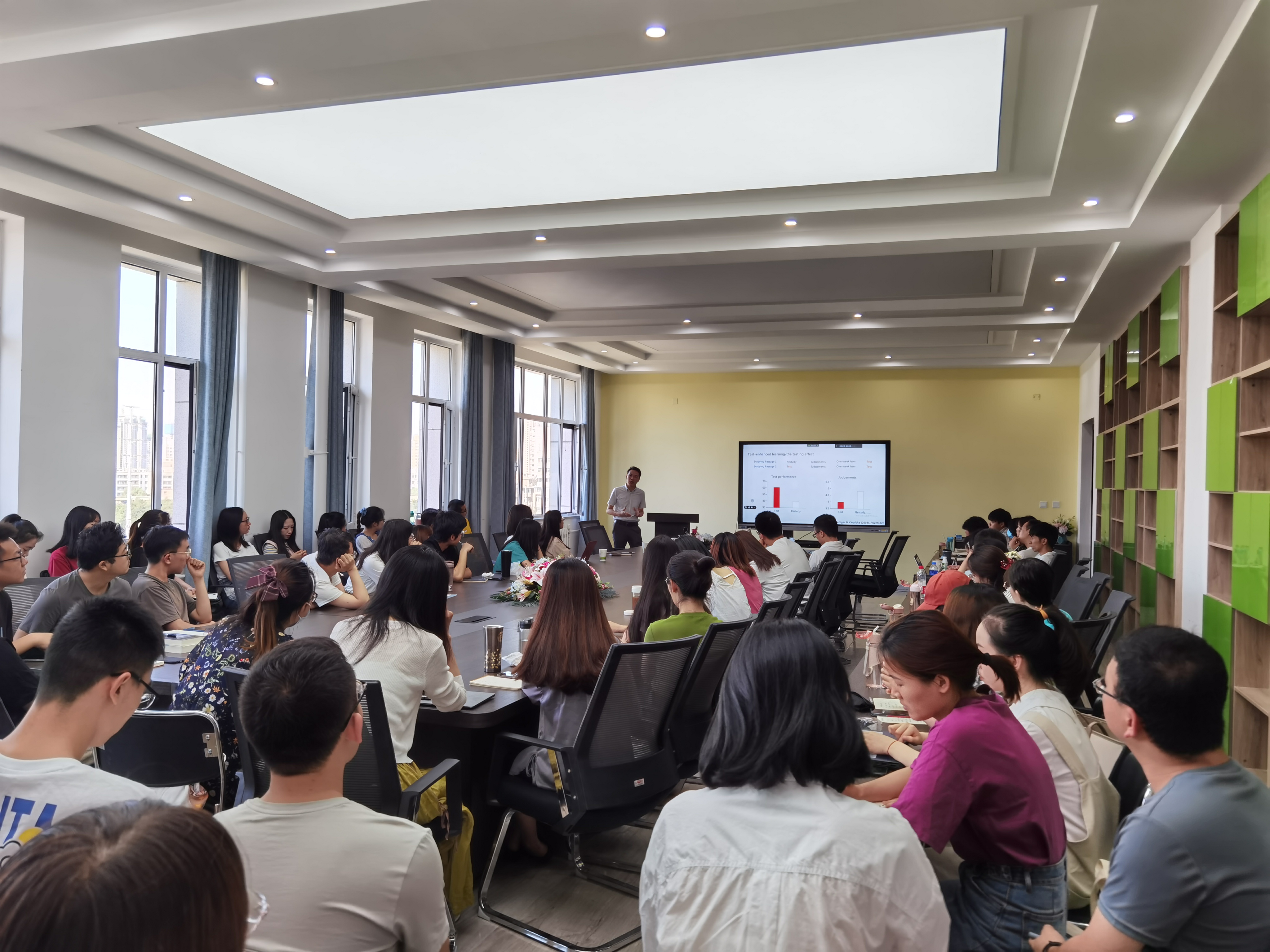 首先,杨老师简要介绍了测试促进记忆效果的已有经典研究,并从测试提取困难和提升学习动机两个角度解释测试促动记忆的机制。而后,杨老师着重从测试是否可以提高学业成就、测试效应在不同学习策略、不同题型上、是否反馈答案、考试次数、不同教育阶段上的差异等方面详细介绍基于真实课堂测试效应的研究。