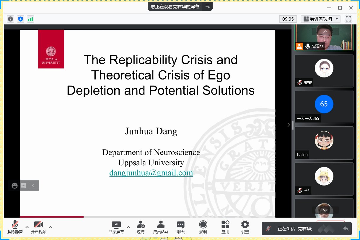 党君华博士首先对自我损耗效应的发展历史进行了系统的回顾,介绍了学界对于自我损耗效应的可重复性及其理论解释都颇有质疑的现状。而后,针对学界关于自我损耗效应相关研究的争论,党老师提出了他自己的建设性解决思路。最后,党老师还详细地介绍了自己正在开展和拟开展的各类研究项目,并邀请同学们参与。