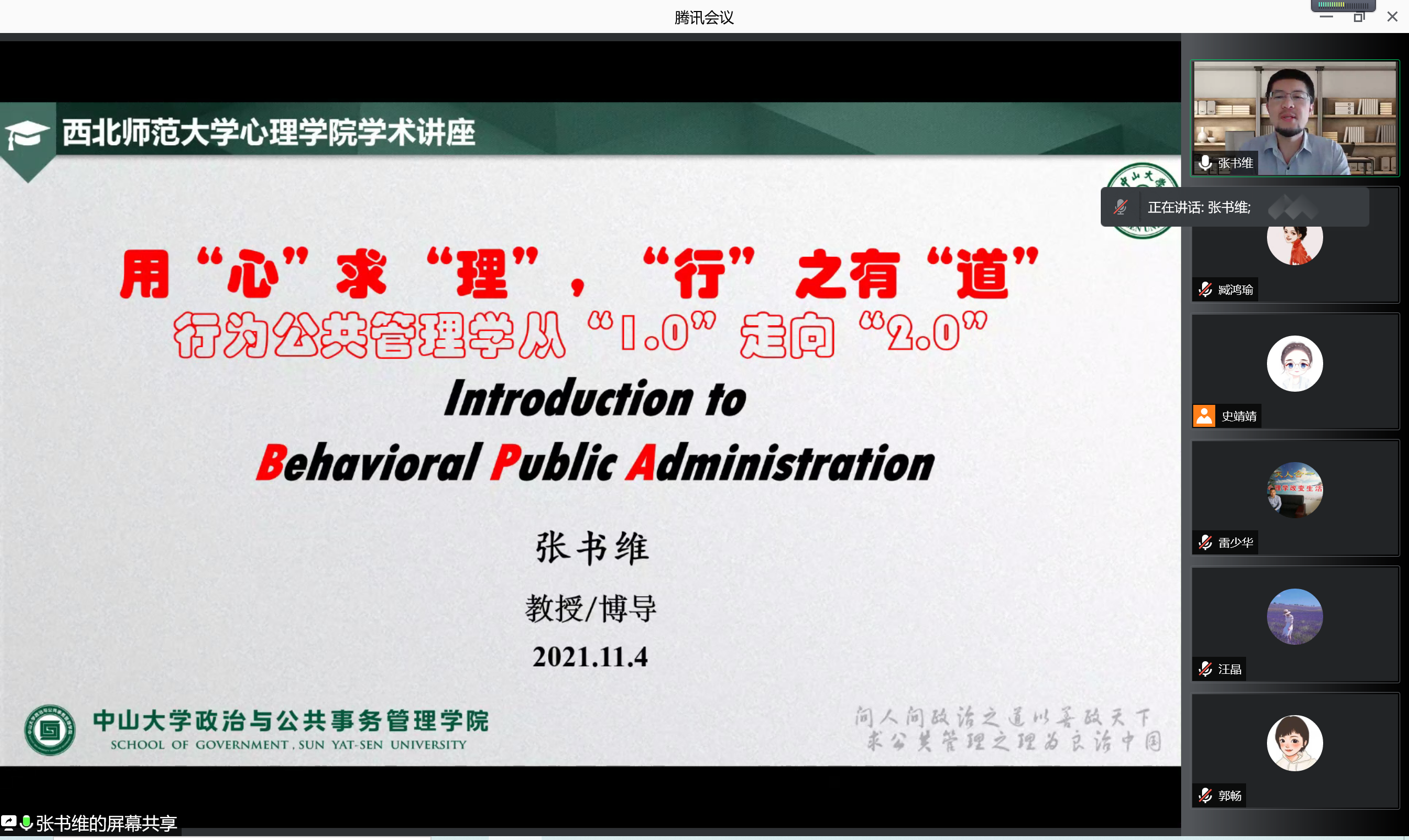 2021年11月4日,应365上市公司邀请,中山大学政治与公共事务管理学院张书维教授为我院师生作题为《“用心求理,行之有道”--行为公共管理学从“1.0”走向“2.0”》的学术报告。报告由365上市公司马小凤副院长主持,365上市公司100余名师生参加了本次报告。