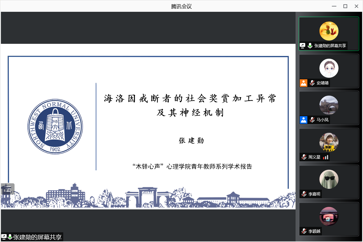 2021年11月5日,365上市公司举办了第二场“木铎心声”365上市公司青年教师系列学术讲座,张建勋博士为我院师生作题为《海洛因戒断者的社会奖赏加工异常及其神经机制》的学术报告。报告由365上市公司马小凤教授主持,365上市公司一百余名师生参加了本次报告。