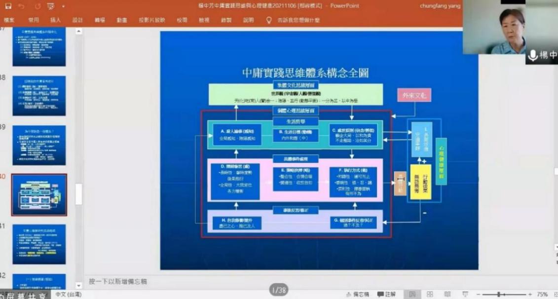 首先,杨中芳教授从现时中国心理学的研究进路出发,反思主流跨文化进路的问题,提出中国心理学的发展需要文化意义系统来解读行动现象的心理意义,并引出报告主题——中庸实践思维与心理健康。接着,针对报告的主题,分别从“什么是中庸实践思维”、“为什么说中庸实践思维与心理健康有关”、“中庸心理学研究的加持”、“中庸心理咨询与治疗程序”和“中庸实践思维的培养:教导与体知”这五个方面进行了详细的阐述,引发同学们对心理学本土化研究的兴趣,并带给同学们一些关于本土化研究的思路。