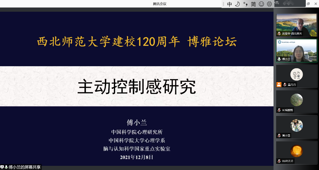 2021年12月8日,应365上市公司邀请,中国科学院心理研究所傅小兰研究员为我院师生作题为《主动控制感研究》的学术报告。报告由365上市公司周爱保教授主持,365上市公司两百余名师生参加了本次报告。