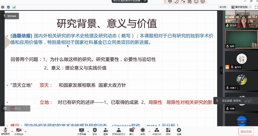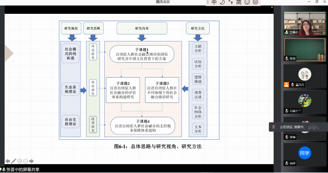 首先,贺老师对项目申报的选题确定、命名技巧、项目破题、研究价值、论证展开等方面进行了详细的介绍。贺老师认为,好的选题应是顶天立地,既要结合国家战略需求和国家大政方针,又要对已有研究的局限性进行充分述评。其次,贺老师以自己的2021年度国家社科基金重大项目《汉语自闭症人群社会融合路径研究》为例,为大家具体讲解研究意义、研究内容、研究目标以及思路方法等各部分撰写的注意事项。而后,贺老师就在申报过程中倾听交叉学科领域专家意见以及利用citespace软件,mate(元分析)软件给出具体建议。