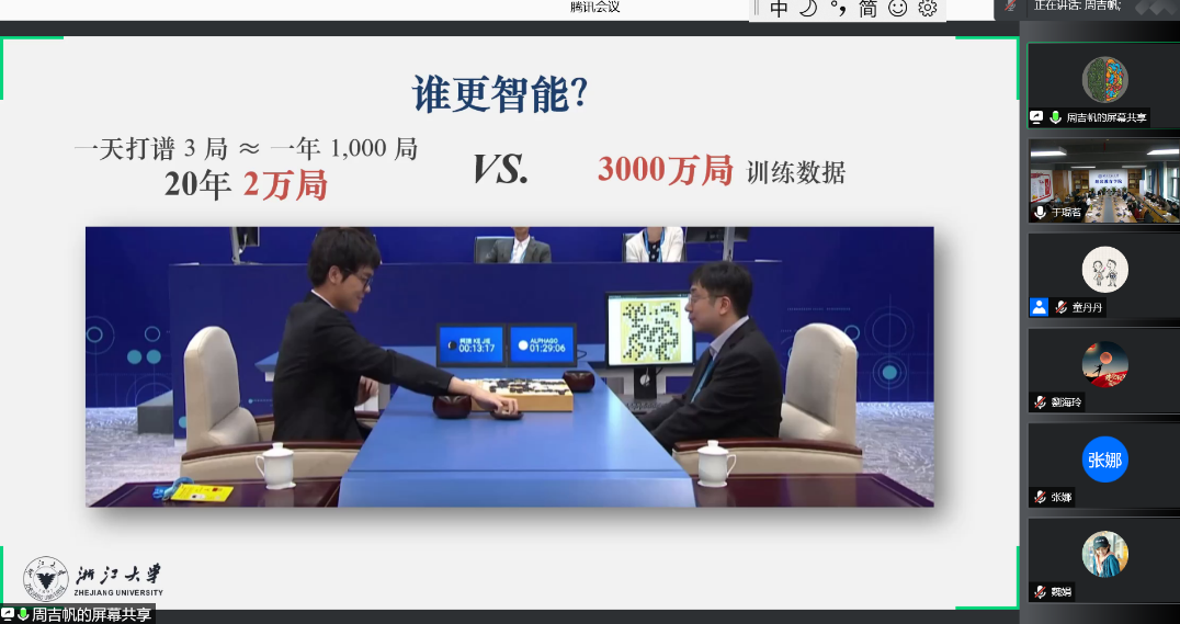 首先,周吉帆教授从人工智能的发展水平、AIpha Go、AIpha Zero、AIphaDogfight、人工智能与人类智能等方面介绍了人工智能的研究背景,并基于人工智能的大数据、小任务瓶颈,引出向人学习的必要性。而后,周教授分别从主动构建常识系统、主动学习的认知基础是什么、工作记忆的主动信息编码等方面对人类的主动信息加工进行了详细讲授,引发同学们对该研究领域的兴趣和了解。