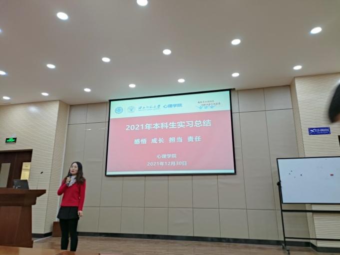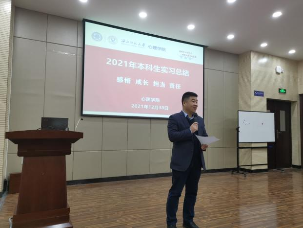 2021年12月30日,学院在新校区特教楼159报告厅组织2021年本科生教育实习总结活动。此次活动以“感悟、成长、担当、责任”为主题,旨在巩固实践育人成果,总结和反思本科生教育实习工作的经验。学院王仁书记、刘显翠主任及承担此次教育实习指导工作的朱雅雯、袁彦、张彦驰、曹华等老师,与2018级60余名本科实习同学一起参加活动。活动由康廷虎副院长主持。