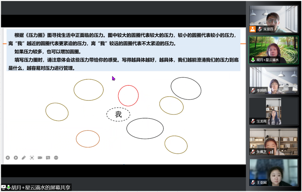 胡月教授以体验式学习的方式带领同学参与到以压力管理为主题的团体心理辅导活动中,引导大家表达自己的压力情绪与背后原因,寻找应对压力的策略,中间还穿插了各种小游戏,各位同学进行了积极的交流与讨论。胡月教授亲切温暖的工作方式不仅缓解了同学们的压力,还使同学们对团体心理辅导有了更多的体会和感受。最后,胡月教授再次梳理了整个团体辅导过程,从体验上升到理论层面,使得同学们对团体心理辅导有了更多的理解。