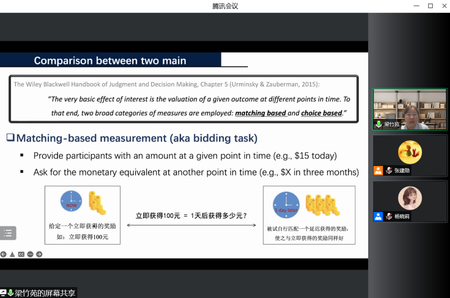 梁竹苑副研究员首先介绍了跨期决策的基本特征、理论发展和测量方法,并引出了健康跨期决策的概念及其常见的测量方法。其次,梁竹苑副研究员阐述了健康跨期决策的领域特异性问题以及健康跨期决策的影响因素。此外,梁竹苑副研究员分享了其研究团队围绕该主题开展的系列研究。这些研究主要考察了健康匮乏和金钱匮乏对健康跨期决策的影响。最后,梁竹苑副研究员对健康跨期决策今后的研究方向进行了展望。梁竹苑副研究员的精彩讲解引发了同学们对健康跨期决策相关问题的思考。