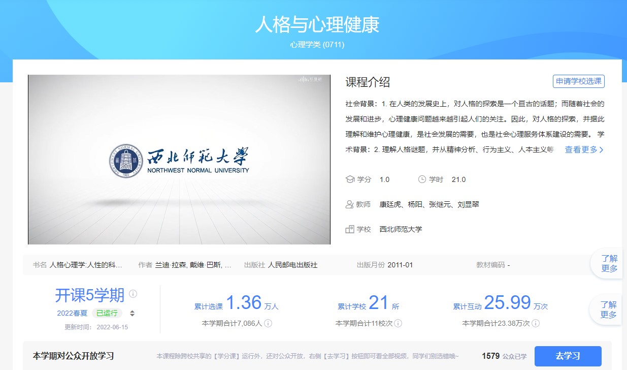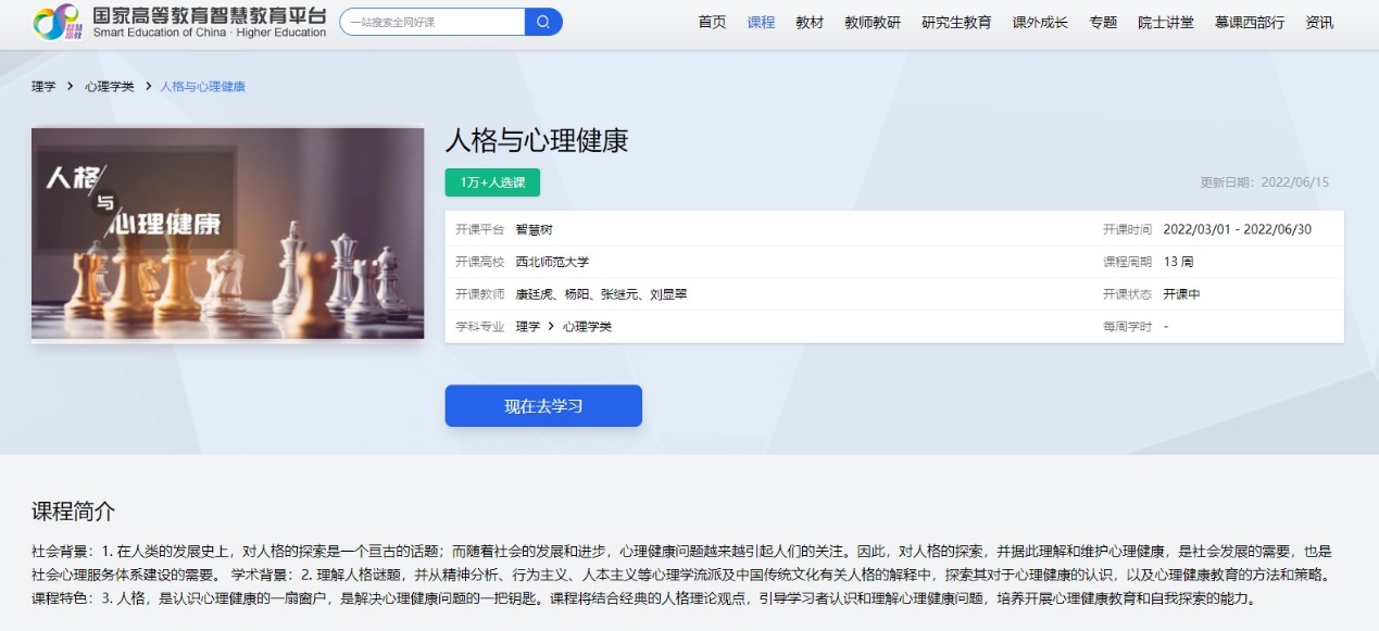 2022年6月14日,教育部心理学教指委通报评审结果,康廷虎教授申报的“学生能力发展为导向的课程模块融合与混合式教学探索”获得2021-2022年度心理学教指委教育教学改革项目立项。该项目拟结合学校支持建设并在国家高等教育智慧教育平台运行的《人格与心理健康》线上课程资源,探索线上线下混合式课程建设与模块化融合路径。