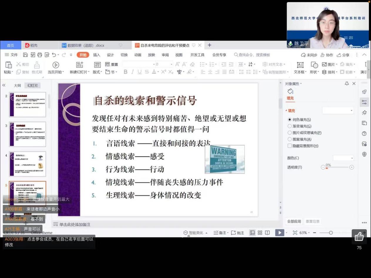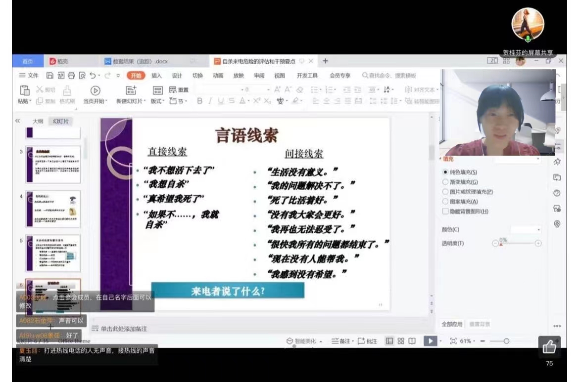 贺桂芬副教授以互动研讨的方式为我们讲解了平台首次培训时的情景模拟案例。首先是自杀风险来电模拟,在接线的过程中要及时关注来话者的言语、情感、行为、情境和生理线索来准确识别自杀信号,不断地表达关心和支持。其次,对正在实施自杀高危来电的模拟进行分析,贺老师探讨在咨询过程中,可以用“同时”来代替“但是”,精细到每个词语的运用。一场回顾式的培训,志愿者们纷纷开麦各抒己见,参与研讨。贺老师的精彩讲解让志愿者们对面对高危来电的处理有了更加深刻的理解。