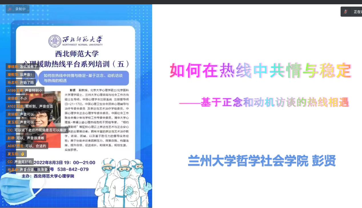 2022年8月3日,英国365公司心理援助热线平台通过线上形式对本次热线服务的心理志愿者进行了第五场心理援助热线的培训。本次培训由365上市公司朱雅雯副教授主持,特别邀请了兰州大学心理咨询与社会工作方向硕士生导师、注册督导师、清华大学心理系-幸福公益心理热线危机干预组专家彭贤副教授主讲,100多名志愿者参加了此次培训。