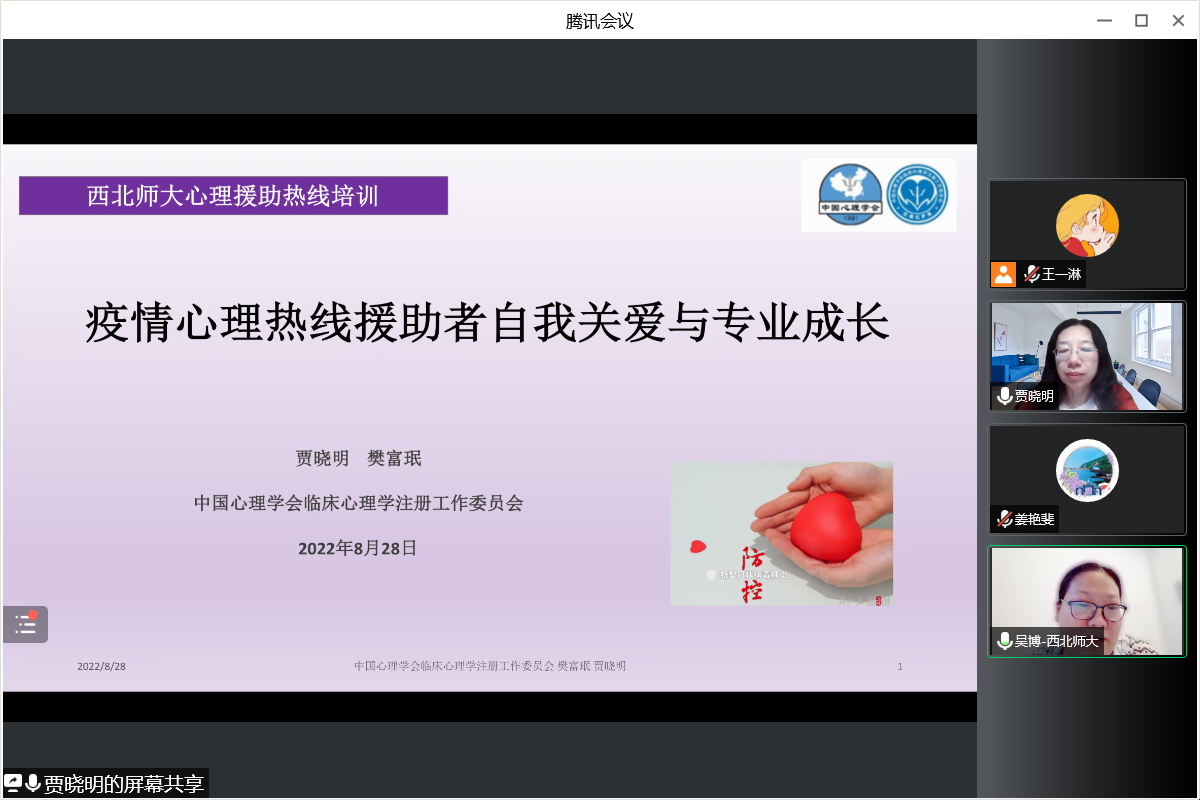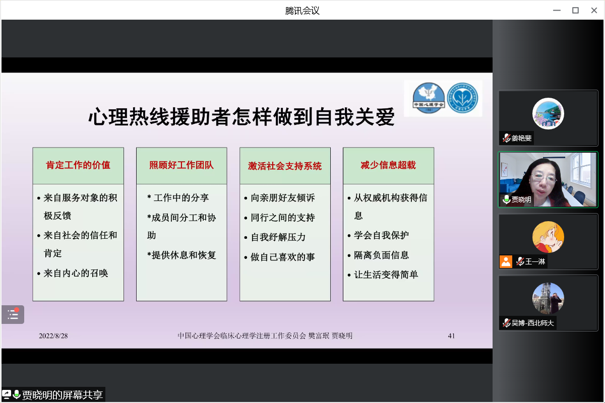 贾老师首先介绍了疫情防控下,心理热线援助面临的挑战。而后,就疫情防控下心理热线援助者的自我关爱问题谈到自我关爱是专业伦理的要求,心理热线援助者自我关爱的需要和自我关爱的方法与途径。接下来,贾老师向志愿者们介绍了心理热线援助者自我关爱的具体方法,包括坚定助人者的职业信念、从助人专业工作中获得成长、坚持锻炼身体、合理安排工作和生活、增强人际联结保持对他人的关怀等。最后,贾老师提出了热线心理援助促进自我专业成长需要强调的三个方面——自我觉察、文化敏感与文化共情、信仰与谦卑。