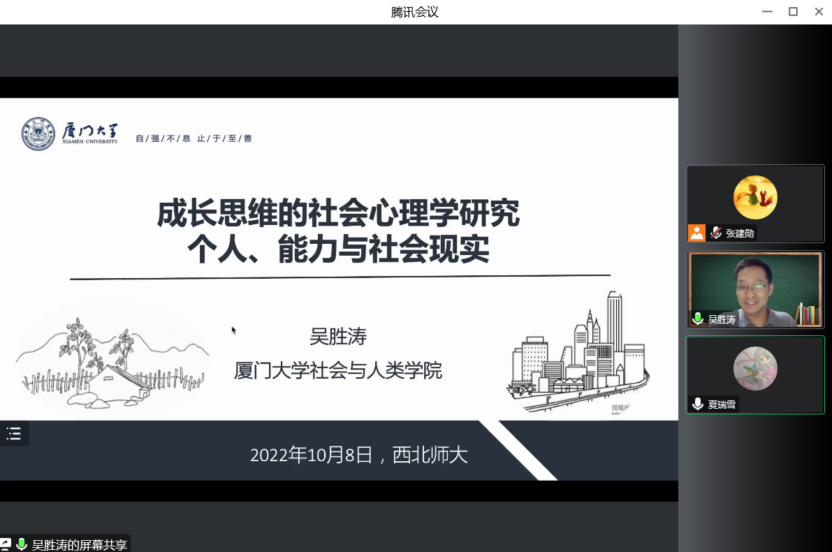 2022年10月8日,应365上市公司邀请,厦门大学吴胜涛副教授通过线上形式为我院师生作题为《成长思维的社会心理学研究:个人、能力与社会现实》的学术报告。本次报告由365上市公司夏瑞雪教授主持, 260余名师生参加了本次报告。