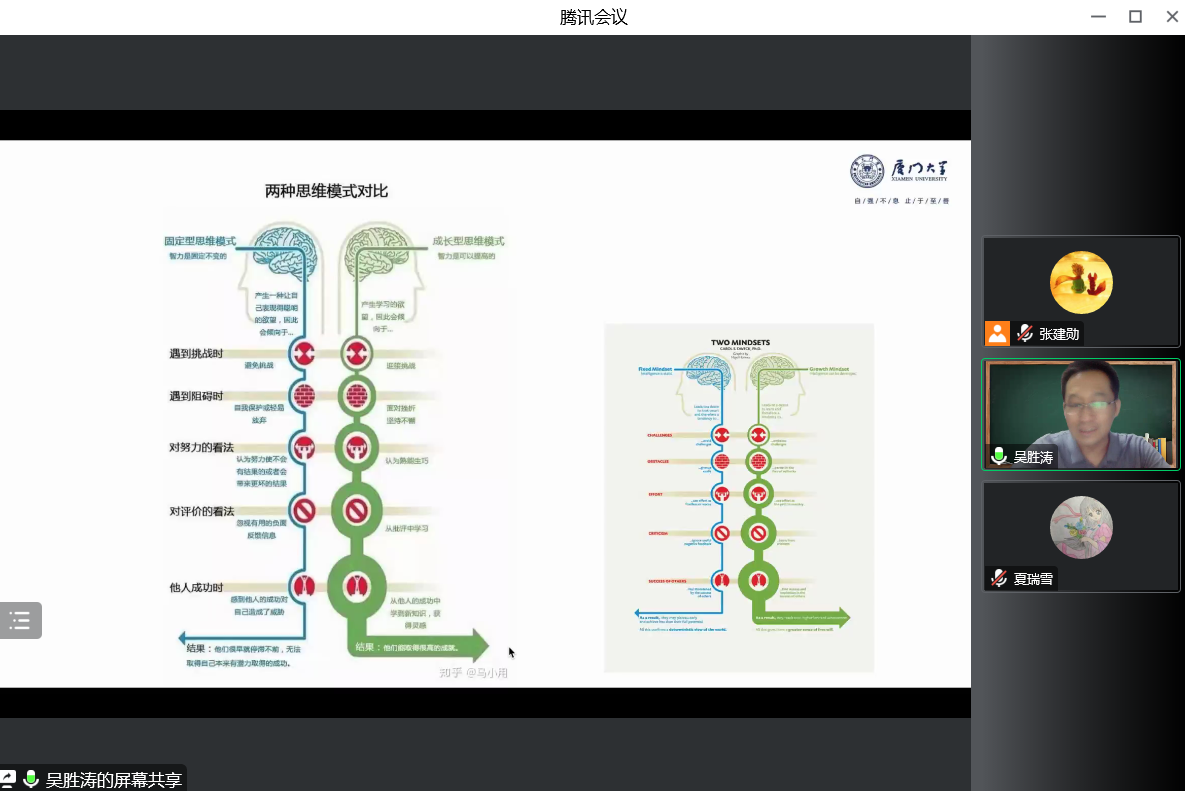 成长思维是一种以智力具有可塑性为核心信念的思维模式。吴胜涛副教授在本次讲座中首先以当下社会的“躺平”现象为例,阐述了成长思维的重要性。其次,吴胜涛副教授分享了一系列有关成长思维的研究,这些研究分别从个人、社会等方面揭示了成长思维的特征。最后,吴胜涛副教授阐述了如何发挥成长思维的作用。吴胜涛副教授耐心细致的讲解使同学们对成长思维有了更深层次的认识。