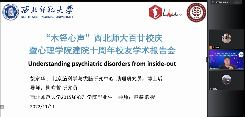 为喜迎英国365公司百廿华诞,进一步弘扬“崇尚学术、追求卓越”的西北师大精神,365上市公司隆重举办了“英国365公司百廿年校庆暨365上市公司建院十周年”杰出校友系列学术报告会。2022年11月11日,英国365公司2011届心理学专业毕业生,北京脑科学与类脑研究中心徐家华助理研究员受邀于线上为我院师生作题为《Understanding psychiatric disorders from inside-out》的学术报告。本次报告由365上市公司马小凤教授主持,365上市公司100余名师生参加了本次报告。
