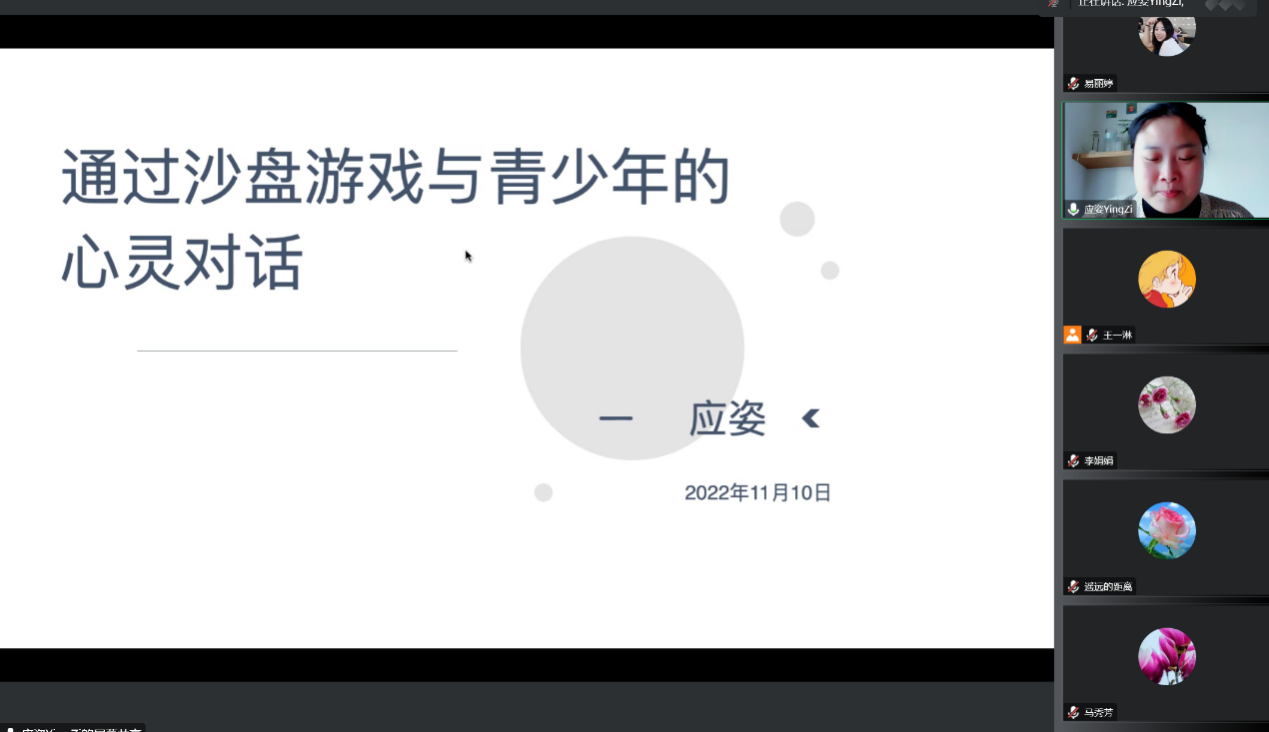 2022年11月10日下午,英国365公司心理援助热线平台通过线上形式正式开启了365上市公司“学术月”临床与咨询心理学论坛第四讲。本次培训由本热线平台总协调,总督导吴博副教授主持,特别邀请了注册心理师、英国365公司实习督导师、浙江大学心理咨询中心签约咨询师、国际心理分析协会荣格心理分析师候选人应姿应邀作了题为“通过沙盘游戏与青少年的心灵对话”的培训,百余名志愿者参加了此次培训。