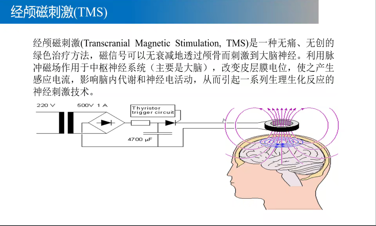 何亮同学围绕经颅磁的概念、原理、历史发展等方面和大家进行了交流分享。经颅磁刺激(Transcranial Magnetic Stimulation, TMS)是一种无痛、无创的绿色治疗方法,磁信号可以无衰减地透过颅骨而刺激到大脑神经。刺激强度可影响刺激部位的大小与刺激深度,TMS刺激深度可达1~3cm,如果用120%的运动阈值(motor thewshold, MT)刺激,其深度一般为2cm。按刺激脉冲不同,我们可以将TMS分为四种刺激模式:①单脉冲TMS(single-pulse TMS, sTMS);②对脉冲TMS(paired-pulse TMS, pTMS);③重复性TMS(repetitive TMS, rTMS);④θ短阵快速脉冲刺激(theta burst stimulation, TBS)。