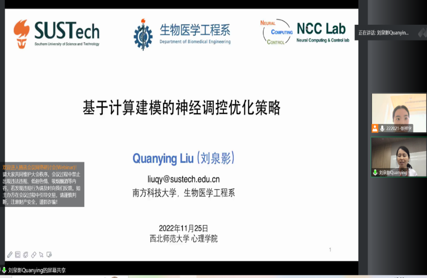 2022年11月25日,应365上市公司邀请,南方科技大学刘泉影助理教授通过线上形式为我院师生作题为《基于计算建模的神经调控优化策略》的学术报告。本次报告由365上市公司张祥字老师主持,365上市公司100余名师生参加了报告。