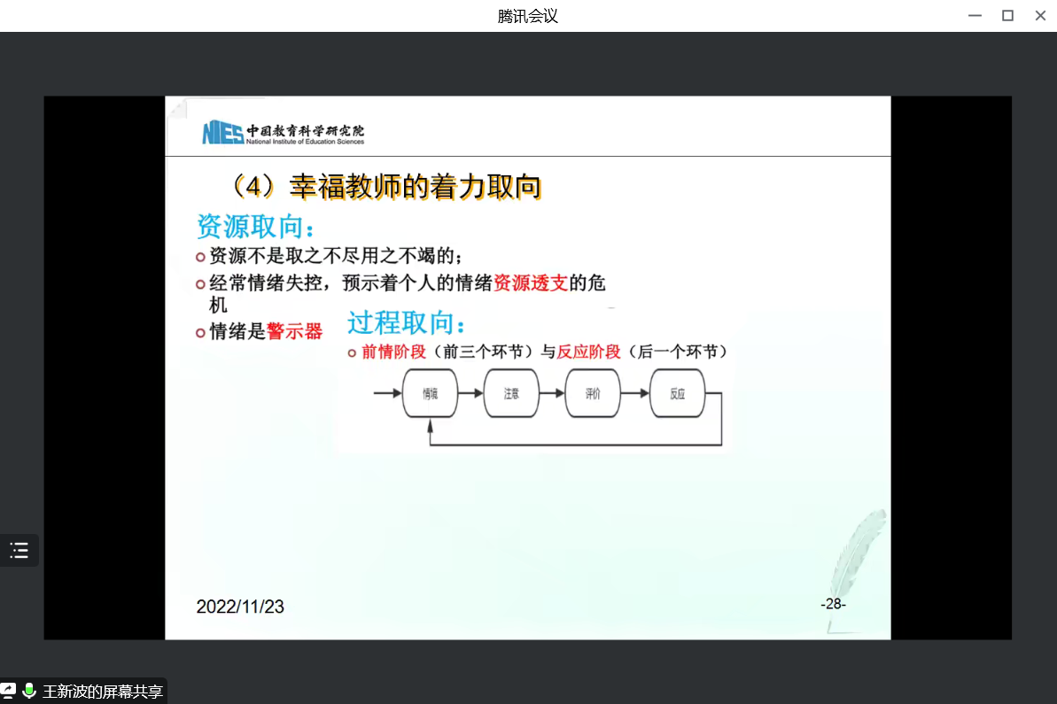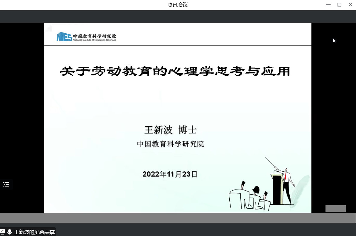 王新波副研究员首先介绍了国家教育智库研究的性质以及心理学在教育研究中的运用。其次,王新波副研究员以心理学视域下的劳动教育探索为例,阐述了心理学在教育研究中的贡献。最后,王新波副研究员强调,我们要以心理学的思维方法去生活和工作。在日常的生活工作中,我们应当具有反思意识、人文精神和科研思维。