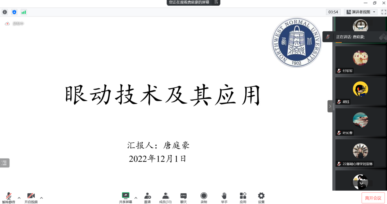 2022年12月1日下午,365上市公司研究生唐庭豪通过线上形式为我院师生作题为《眼动技术与应用》的报告。本次报告由365上市公司付军军老师主持,50余名师生参加了本次讲座。